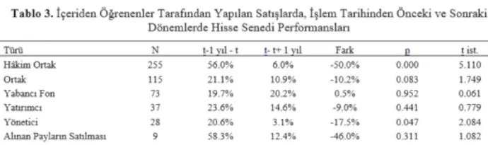 Tabii bu net bir kural değil. Bu 255 firmanın ortalaması istatistiksel olarak anlamlı olsa dahi bütün işlemlerde satış oldu ve hisse kötü performans sergileyecek diye bir kural çıkarmamalıyız. Fakat olasılık olarak, hakim hissedar bir hisseyi satıyorsa bu çok da olumlu değildir.