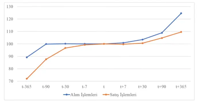 Yukarıdaki grafikte hakim hissedarlar ya da içeriden öğrenenler tarafından yapılmış alış ve satışların öncesinde ve sonrasındaki performansı görüyoruz. Alım işlemlerine baktığımızda nispeten kötü performans göstermiş hisseleri aldıklarını ve alım işleminden sonra da daha pozitif bir performans gerçekleştiği, satış işlemlerinde ise çok iyi performans göstermiş hisselerin satıldığını fakat satış işleminden sonra da performansın daha kötü gerçekleştiğini görmekteyiz. Bunlar da bize hakim hissedarların alım ya da satışlarının belli derecede anlamlı olduğunu gösteriyor.