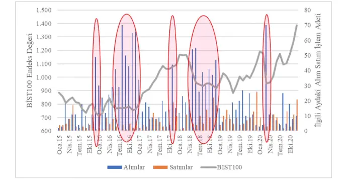 Yukarıdaki grafikte de içeriden öğrenenler tarafından yapılan alım satım işlemlerinin ve BIST 100 endeksinin performansını görmekteyiz. Alım işlemlerinin özellikle BIST 100 endeksinin dip yaptığı seviyelerde yoğunlaştığı görülüyor. Satış işlemleri ise daha çok BIST 100 endeksi zirvedeyken gerçekleşmiş ve alımların yoğunlaştığı dönemleri takip eden dönemlerde BIST 100 endeksinin her defasında rally ile cevap verdiği görülüyor. Bu da aslında içeriden öğrenenlerin çok daha becerikli bir şekilde yatırım kararı aldığının teyidini vermekte.