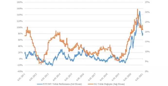 Yukarıdaki grafikte M2 para arzının yüzdesel olarak yıllık değişimini ve XTUMY endeksinin yıllık performansın görüyoruz. Dikkat ederseniz para arzı çekilirken XTUMY endeksi de düşüyor, ama geriden düşüyor. Yani önce para arzı düşüyor, sonra XTUMY endeksi düşüyor. Sonra para arzı artıyor, arada 3 aydan 1 yıla kadar uzayan bir gecikme ile de para arzı artıyor. Takip eden dönemde XTUMY endeksi yükseliyor, sonra para arzı çekiliyor. Yani XTUMY endeksi bazen 3 ay, bazen 6 ay bazen 1 yıl geriden takip ediyor.