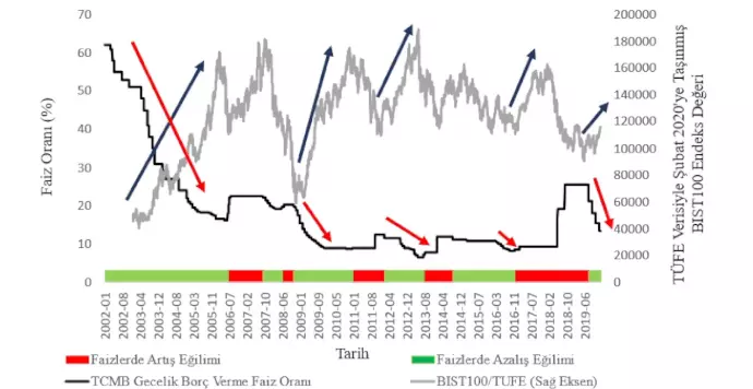 Bazen de faizin artacağı belliyken borsa yükselebilir. Bir dizi çalışmada faiz oranlarının ya da enflasyonun çeşitli sektörlere ya da borsadaki farklı şirketlere etkisi analiz edilmiş. Bu analizlerde, eğer bir hissede yatırımcı profili daha yetkinse daha bilgili ise faizlerin artmasını beklemeden gerekli aksiyon alınır. Fakat yatırımcılar daha bilgisizse bu tepki gecikiyor. Bunu da en net BIST 100 endeksi ve XTUMY (BIST TUM-100) endeksinde görüyoruz.