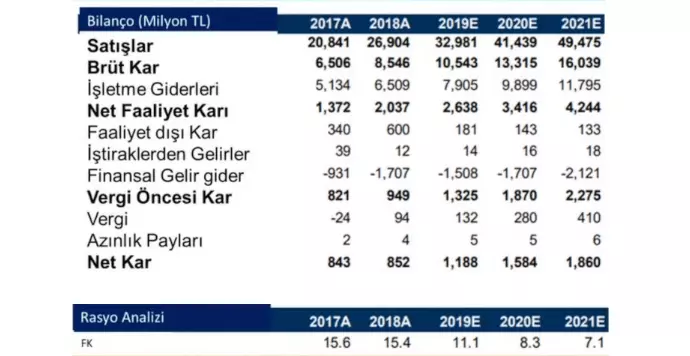 2017 ve 2018 verilerine göre 2019, 2020 ve 2021'i tahmin etmiştler. Gördüğünüz gibi net karda büyüme bekliyorlar. Halihazırda F/K oranı %15.4 olduğu halde gelecekte karın büyümesi nedeniyle bu F/K oranının, mevcut piyasa değerinin korunması halinde, düşeceğini gösteriyor. Tabii bu düşüşe izin verilmeyeceğine göre hisse fiyatının yükselmesi gerekecektir. Şirketler genelde karlarını enflasyon oranında artırırlar, hatta bazıları daha fazla artırır, ve karlılıktaki büyüme de sürdürülebilir F/K açısından kritik öneme sahiptir.