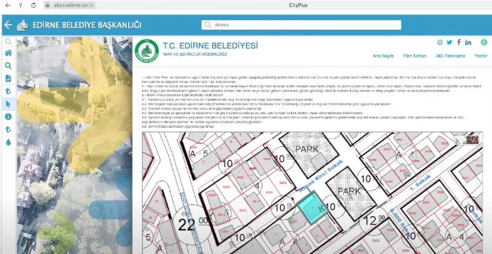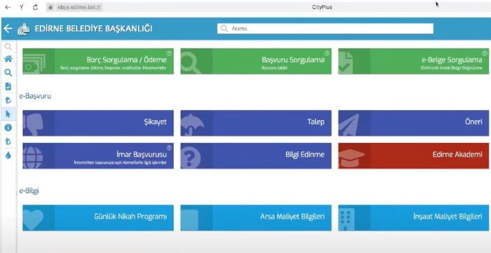 Tabi kısıtlı bilgilerle ama öğrenebilirsiniz. Google'a ya da Yandex'e; Edirne E-İmar yazıyoruz. Buradan Edirne Belediyesi'nin web sitesine giriyoruz ve burada E-belediye'ye tıklıyoruz.