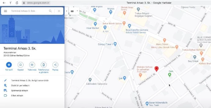 Burada sizin yapmanız gereken, o bölgeyi gezmek olacak. Eğer gezebilirseniz, yani burada panaroma görüntüsünde görebilirseniz, buradan da gezebilirsiniz. Ancak her ilde, her ilçede bu bilgi olmayabiliyor. Bunun yerine ne yapabilirsiniz? Yandex veya Google'ın haritasına gidebilirsiniz. Mesela; o bölgeye gittik. Yine Terminal arkası 3. Sokak diyor. Burada bir park diyor, bunun arkasındaki 2. sokak. Yani bizim haritada bakmış olduğumuz yer, gördüğünüz gibi şu parselin, şu parkın hemen çaprazında bir yer. Hemen buraya gidiyoruz.