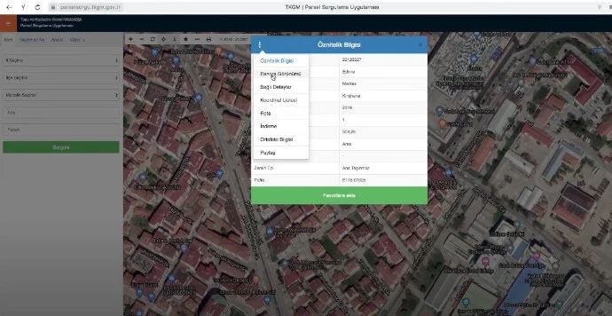Tamamen tahminle herhangi bir yeri merkez olarak seçiyoruz ve bunu tamamen örnek olarak kullanıyoruz. Burada herhangi bir sokakta, ara sokakta herhangi bir yere gidiyoruz ve buraya nokta koyuyoruz. Noktayı koyarken de i harfini seçiyoruz. "i" harfini seçip parsel üzerine noktayı koyduktan sonra bize o taşınmazla ilgili şu bilgileri veriyor.