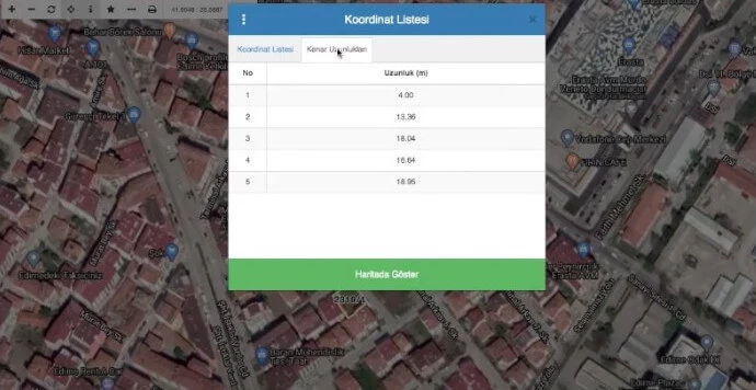 Burada koordinat listesinde; "kenar uzunlukları bilgileri" var. Bu parsel bilgilerine baktığımız zaman burada bir 4 metre görüyoruz. 13 metre, 18 metre, 16 metre, 18 metre. 18 metreler uzun kenarları, 13 metreye 16 metre de biri uzun kenarının daha uzun olan bölümü, diğeri de kısa bölümü olarak anlıyoruz. Buradan da parselin ölçüleri hakkında bilgi sahibi olabiliyorsunuz.