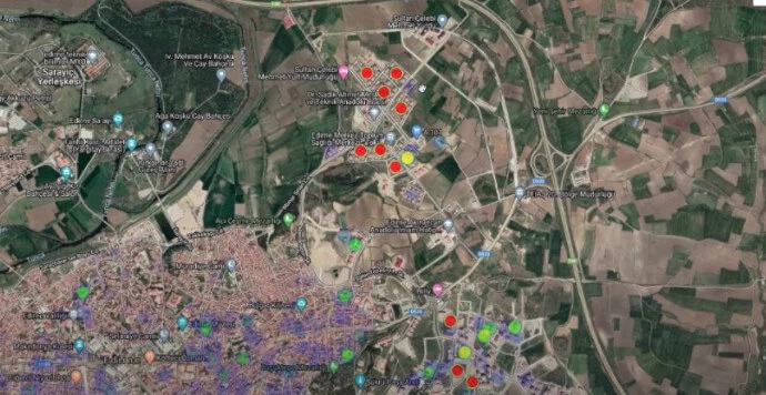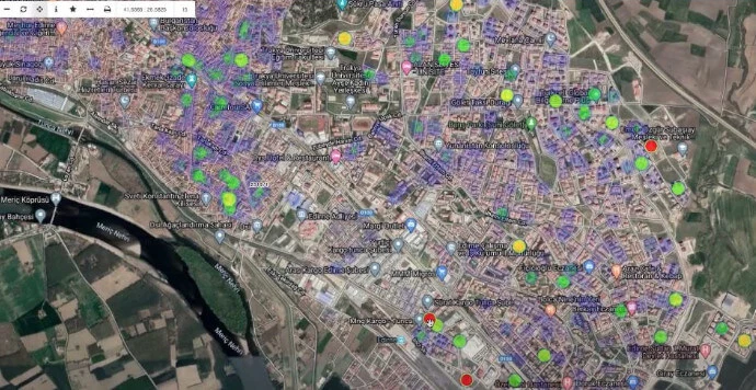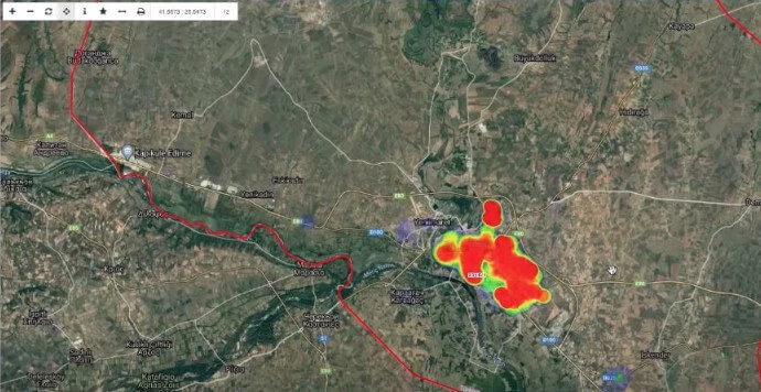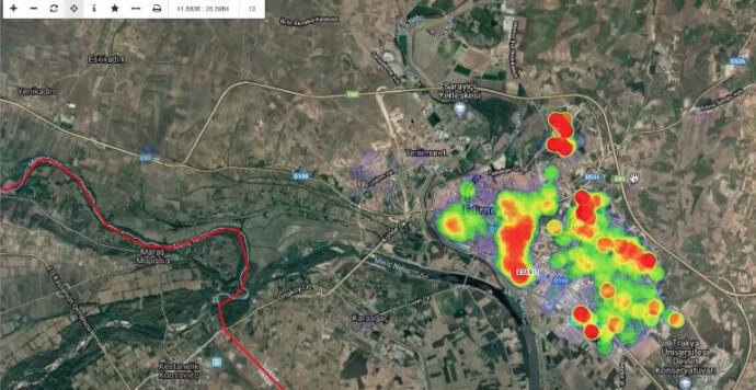 Yoğunluk haritası olarak bize gayrimenkul satışlarını vermesini istiyoruz. Bunu yaptığımız zaman Edirne'nin üzerinde kıpkırmızı bir alan çıkar ve etrafları sarı, dışlara doğru yeşil olmaktadır. Bu bize şunu ifade ediyor; kırmızılar yoğun satışların olduğu yerleri, yeşillerse az satışın olduğu yerleri ifade ediyor.