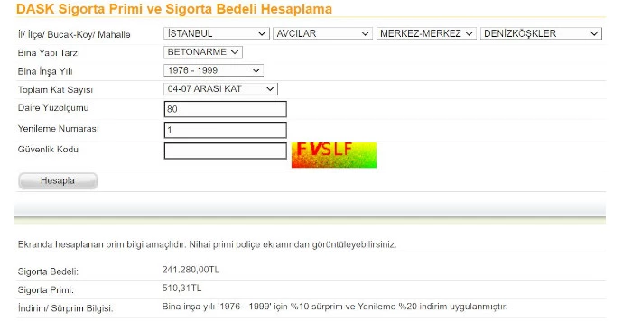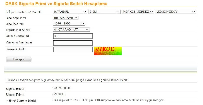 Yukarıdaki resimde gördüğünüz gibi, 80 metrekarelik bir daireyi yeniden yapıldığı takdirde 241.280 TL'ye mal ettiğimizi düşünelim. Sigorta primi olarak da o bölgeyi, Şişli, Mecidiyeköy Mahallesi seçtiğimiz için sigorta birimimizi 327,90 TL olarak hesaplıyor.