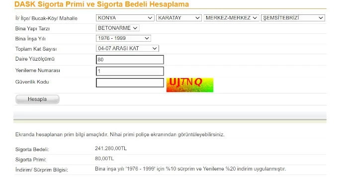 Aynı büyüklükte, aynı metrekarede, yine bir konutu bu defa İstanbul'da değil de Konya'da seçelim. Karatay İlçesi içerisinde Şemsi Rebrizi'yi seçiyoruz ve güvenlik kodunu giriyoruz. Hiçbir bilgiyi diğer bilgileri değiştirmiyoruz ki farkı rahatlıkla görebilin. Sigorta bedeli yine aynı 241.280 TL. Bu Türkiye'nin her yeri için muhtemelen aynı hesaplanıyor. Ancak sigorta primi bu defa 80 TL'ye düşüyor.