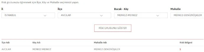 Hesaplarını yaptığımız ilçelerden bir tanesi, İstanbul'un içerisinde Avcılar ilçesinin, yine merkez Bucakköy sekmesinin altında merkez'i seçiyoruz. Mahalle sekmesinde de yine Denizköşkler'i seçiyoruz. Göster dediğimiz zaman Risk Bölgesi 1 olarak görünüyor.
